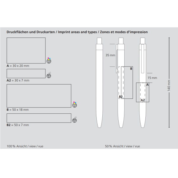 opdruk (max. 30 x 20 mm.) of lasergravering (max. 30 x 7 mm.) op de houder, opdruk (max. 50 x 18 mm.) of lasergravering (max. 50 x 7 mm.) op zijkant clip |