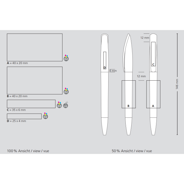 opdruk op de houder (max. 40 x 20 mm. of max. 40 x 27 mm.) opdruk op de achterkant van de clip (max. 25 x 4 mm.) opdruk of digitale druk op de clip (max. 35 x 6 mm. Of max. 25 x 4 mm.) |