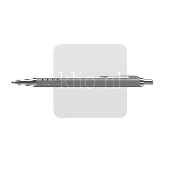 Mat aluminium houder van de balpen met glanzende zilverkleurige metalen onderdelen en gripopeningen onderaan houder. De blauwe vulling heeft een schrijflengte van 3.000 meter, maar kan op aanvraag ook in zwart of tegen meerprijs met nog meer schrijflengte geleverd worden.