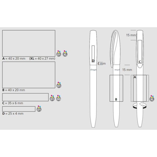 opdruk op de houder (max. 40 x 20 mm.) opdruk aan de achterkant van de clip (max. 25 x 4 mm.) opdruk of digitale opdruk op de clip (max. 35 x 6 mm.) rondom allover |