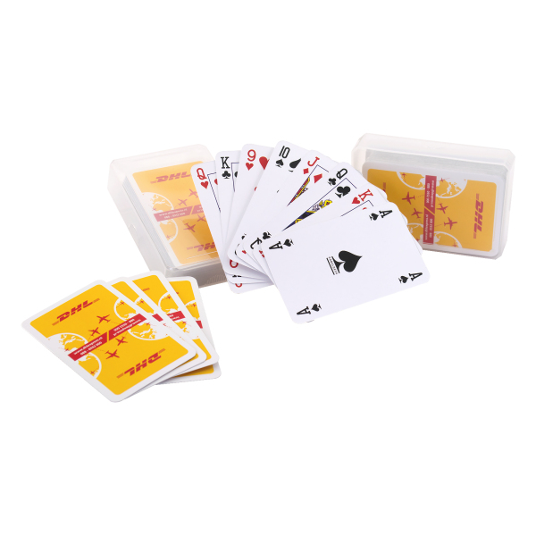Speelkaarten van 320 grams echt speelkaarten karton in het internationale Bridge-formaat. De kaarten hebben 4 hoek-indexen en een spel heeft 55 kaarten (52 + 2 jokers en een bridge score kaart). De rugzijde van de kaarten worden geheel naar wens in 1 design fullcolour bedrukt. De kaarten worden verpakt in een neutraal (onbedrukt) transparant PP kunststof doosje.