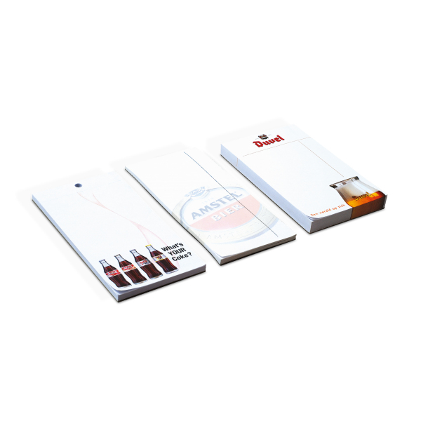 Handig formaat schrijfblok (14,8 x 6,2 cm.) met 50 vel, 80 grams wit papier, gelijmd op een stevig 600 grams grijs onderbord, in zakformaat voor het opnemen van bestellingen of als notitieblokje voor onderweg.