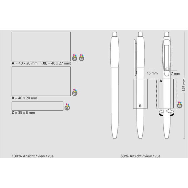 opdruk op de houder (max. 40 x 20 mm.), opdruk op de clip ( max. 35 x 6 mm.) rondom druk allover (max. 40 x 27 mm.) |