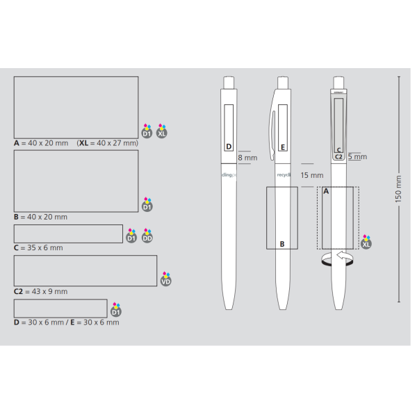 opdruk op de houder (max. 40 x 20 mm. of max. 40 x 27 mm.), opdruk aan de achterkant of zijkant van de clip (max. 30 x 6 mm.), opdruk op de clip ( max. 35 x 6 mm. of 42 x 9 mm.) |