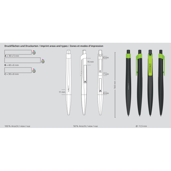 opdruk op de houder (max. 30 x 5 mm.), opdruk aan de achterkant of zijkant van de clip (max. 40 x 6 mm.), opdruk op de clip ( max. 30 x 6 mm.) |