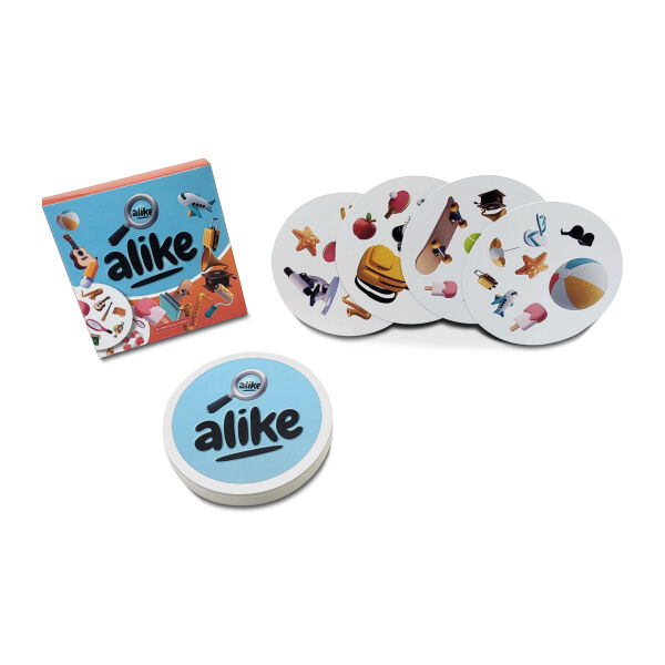 Matching (ook wel Alike genoemd) speel je met het hele gezin. Vind zo snel mogelijk de gelijke afbeelding en speel als eerste al je kaarten weg. Standaard uitvoering: 48 ronde kaarten (8,5 cm.) met 8 symbolen (doosje 88 x 88 x 20 mm). De kaarten kunnen aflopend bedrukt worden, maar een wit boord van 4 mm. is absoluut aan te raden, omdat de kaarten dan langer mooi blijven.
