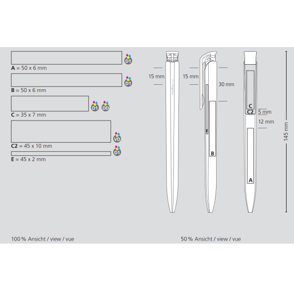 opdruk op de houder (max. 50 x 6 mm.) opdruk 90 graden t.o.v. de clip (max. 45 x 2 mm.) opdruk of digitale opdruk op de clip (max. 35 x 7 mm. of 45 x 10mm.) |