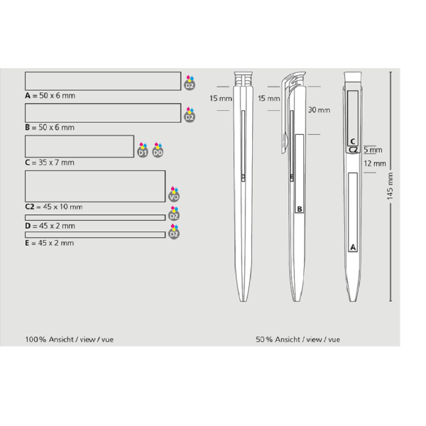 | Bedrukkingsinformatie | opdruk op de houder (max. 50 x 6 mm.) opdruk zijkant clip (max 50 x 6 mm. of 45 x 2 mm.) opdruk 180 graden t.o.v. de clip (max. 45 x 2 mm.) opdruk of digitale opdruk op de clip ( max. 45 x 10 mm. max. 35 x 7 mm.) |
