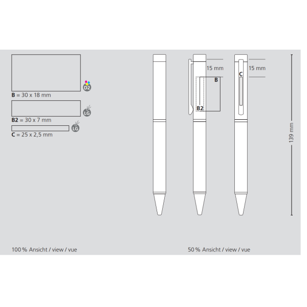 opdruk zijkant clip (max. 30 x 18 mm.) lasergravering zijkant clip (max. 30 x 7 mm.) lasergavering op clip (max. 25 x 2,5 cm) |