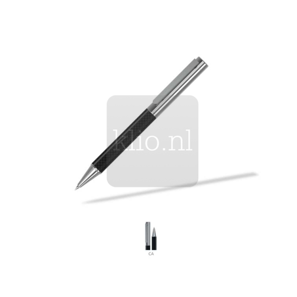 Moderne metalen balpen met carbonlook, draaimechanisme en stijlvolle glanzende metalen onderdelen. De luxe balpen is standaard uitgerust met een blauwschrijvende XL langschrijfvulling met een schrijflengte van maar liefst 8.000 meter! Dus naast de mooie uitstraling is het lange gebruiksgenot ook een duurzame oplossing.