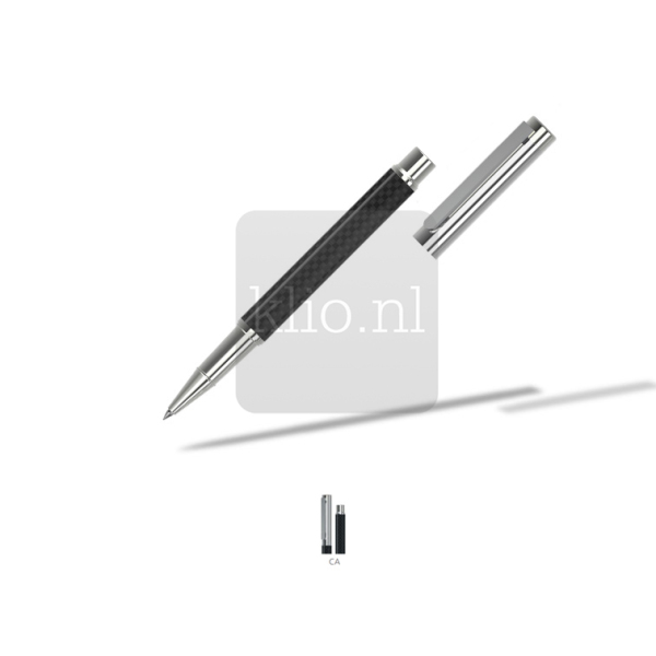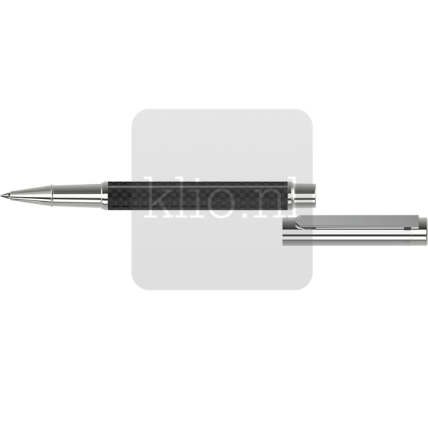 Moderne rollerball met carbonlook en stijlvolle glanzende metalen onderdelen. De luxe rolleballpen is standaard uitgerust met een blauwschrijvende vulling met een schrijflengte van 800 meter.