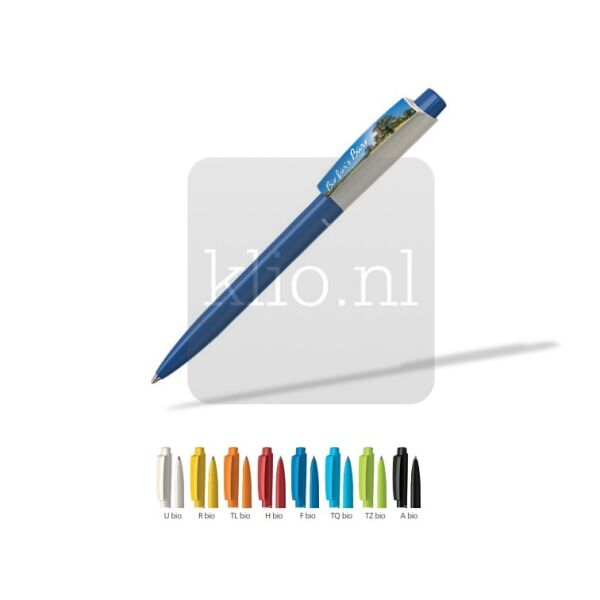 Balpen van biobased plastic gemaakt uit plantaardig zetmeel (PLA) met drukmechanisme. Door de platte achterzijde van het bovendeel blijft de pen stabiel op tafel liggen, zodat jouw reclame mooi in beeld is. Punt, houder, clip en drukknop kunnen naar wens uit bestaande kleuren gecombineerd worden door middel van mix&match principe. Deze bedrukte balpen kunnen we met jouw logo ontwerpen in gewenste kleurensamenstelling. Duurzaam model bedrukte balpen vanwege het biologische materiaal, Duitse hoogwaardige kwaliteit, verse vulling in blauw of zwart en dus ca. 3.000 meter schrijfplezier, productie in Duitsland en dus minimale CO2 uitstoot. Balpen met opdruk met 2 jaar garantie na aankoop. Europese productie.