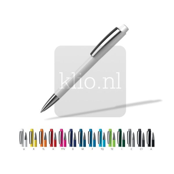 Kunststof balpen met drukmechanisme, metalen punt en clip, glanzende kleuren. Door de platte achterzijde van het bovendeel blijft de pen stabiel op tafel liggen, zodat jouw reclame mooi in beeld is. Houder, bovendeel houder onder clip en drukknop kunnen naar wens uit bestaande kleuren gecombineerd worden door middel van mix&match principe. Deze bedrukte balpen kunnen we met jouw logo ontwerpen in gewenste kleurensamenstelling. Duurzaam model bedrukte balpen vanwege de Duitse hoogwaardige kwaliteit, verse vulling in blauw of zwart en dus ca. 3.000 meter schrijfplezier, productie in Duitsland en dus minimale CO2 uitstoot. Balpen met opdruk met 2 jaar garantie na aankoop. Europese productie.